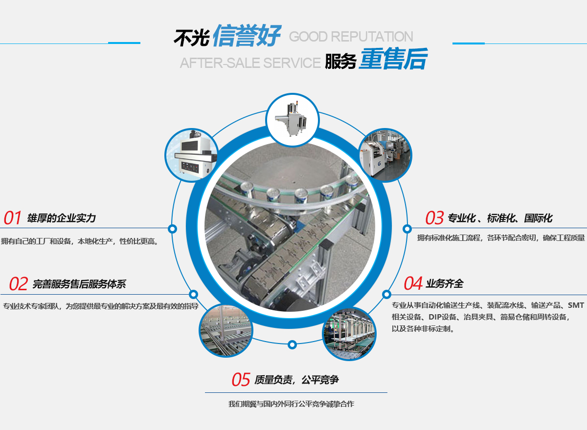 我公司致力于電子、工業(yè)新技術(shù)推動的新產(chǎn)品工藝的設(shè)備配套,專業(yè)從事自動化輸送生產(chǎn)線、裝配流水線、輸送產(chǎn)品、SMT相關(guān)設(shè)備、DIP設(shè)備、治具夾具、簡易倉儲和周轉(zhuǎn)設(shè)備,以及各種非標(biāo)定制.....